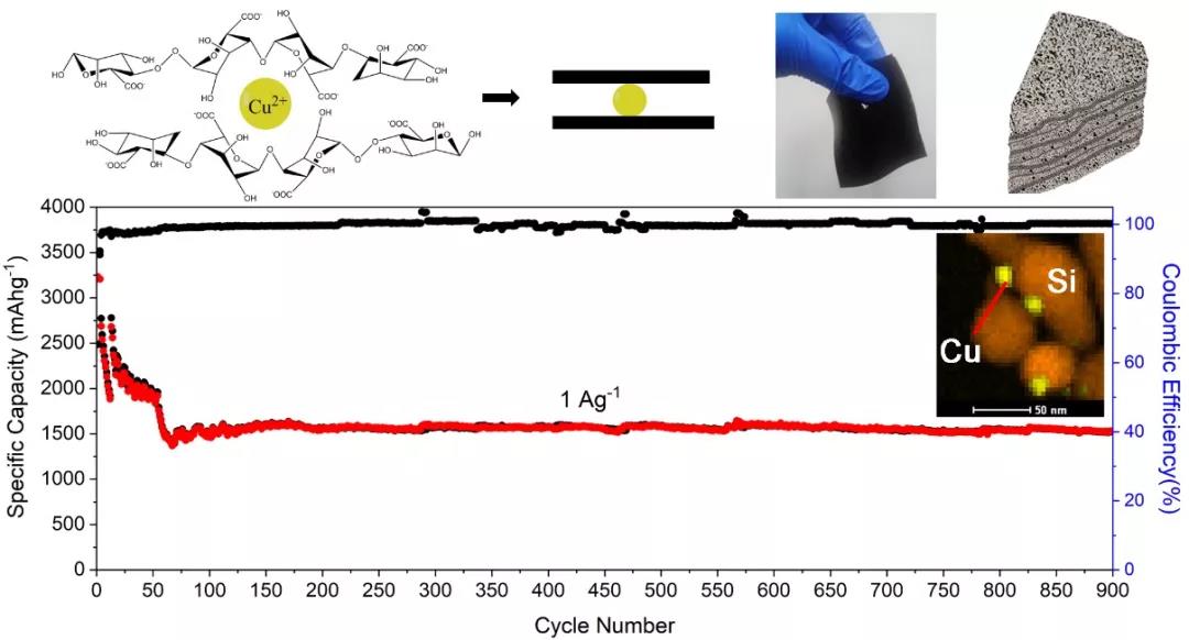 西安交大金屬材料強度國家重點實驗室與西安交大蘇州研究院及納米學院合作,基于原位可控凝膠化過程,制備出Cu導電添加劑及碳納米管增強的多層硅/碳復合結構。其多層結構特征和碳納米管增韌碳基體可有效釋放充放電過程中硅負極體積變化而產生的巨大應力,Cu導電添加劑的引入提升了復合材料的導電性。該復合材料電極在1A·g-1的大電流密度下經過900次循環后比容量達到1500mAh·g-1;在4A·g-1的大電流密度下循環展示出1035mAh·g-1的比容量,充分表明在硅顆粒巨大體積變化過程中電極材料仍保持優異的結構穩定性。該復合電極材料的Li+擴散系數在10-11至10-9cm-2·s-1范圍內,具有快速充放電特性。